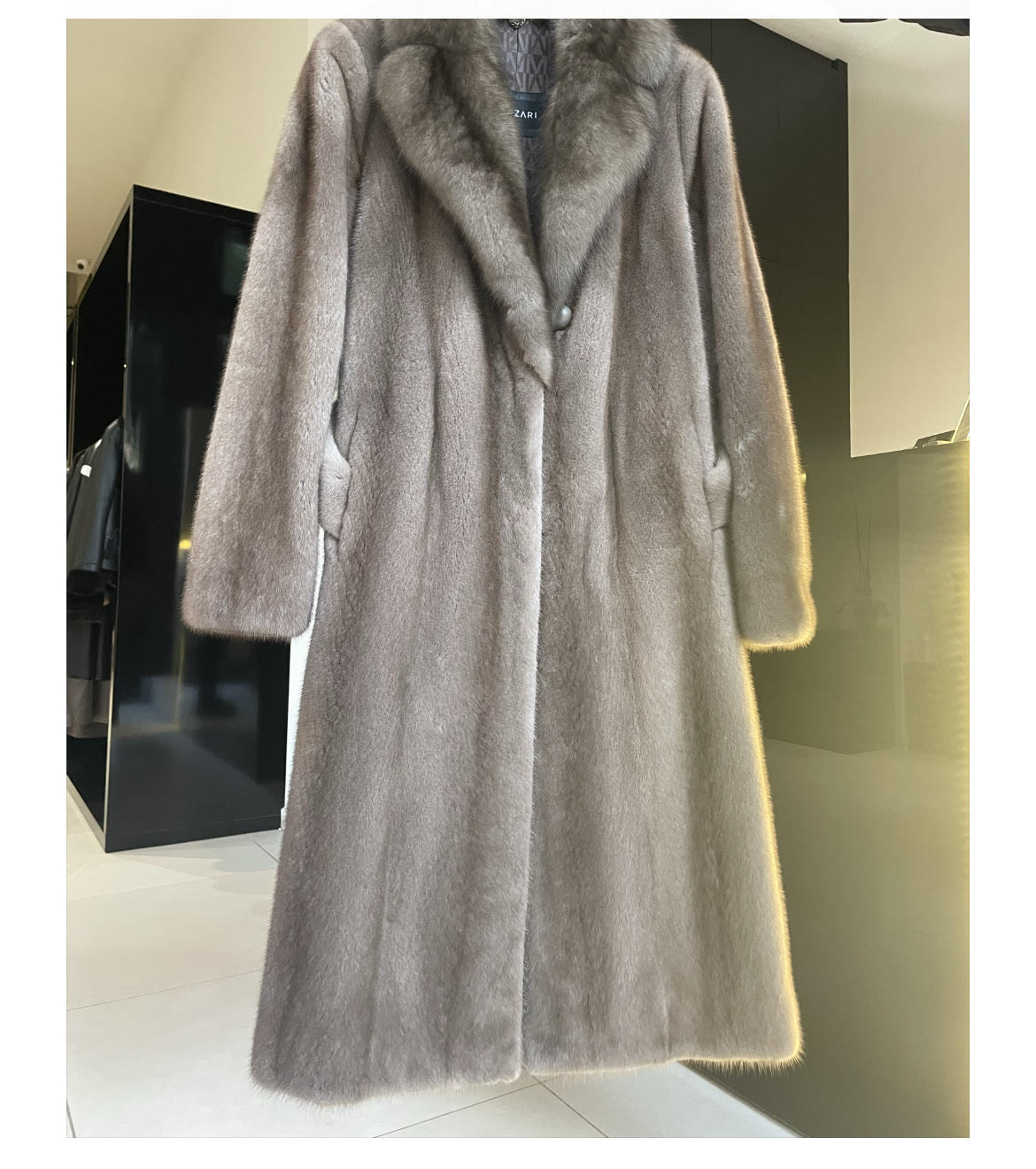 معطف الفرو من المنك مع طوق السباع، الحجم 44، الطول 115 سم. السعر 2500.