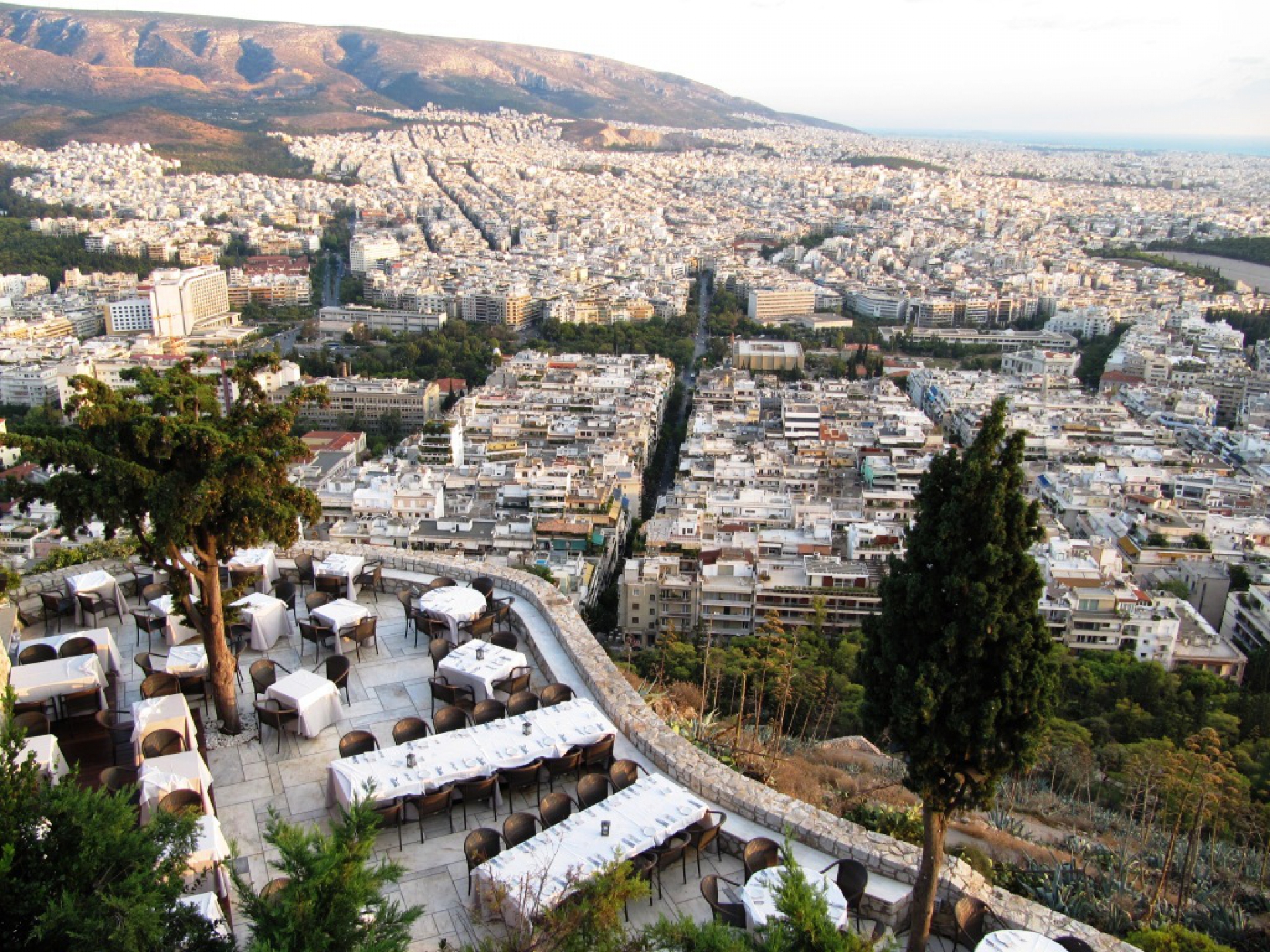Терраса с одним из самых эффектных «почти-открыточных» видов на Акрополь. Хороший вариант для ужина или бокала вина «с панорамой».