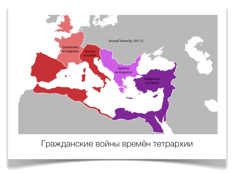 С 293 года у двух Августов Диоклетиана и Максимиана появились по одному первому заместителю с менее важным титулом Цезаря (Царя). Выбор пал на Констанция Хлора и Галерия Максимиана. Царю выделялся отдельный регион, где он правил и воевал с внешними врагами империи. Система правления после 293 года получила название Тетрархия (Четверовластие), хотя, по сути, являлась модернизированной формой двоевластия, так как царей назначали Августы и цари находились в подчинении каждый у своего Августа. Они как 4 башни защищали стены крепости государства римского. Но какая же из башен уступит другой? По задумке Диоклетиана каждый из Августов уходил через 20 лет на покой и его место занимал Царь, который становился Августом и назначал себе следующего царя. Пока одним из августов был сам Диоклетиан с его гигантским авторитетом система работала. Как только Диоклетиан ушел на покой, его ближайшие соратники сцепились между собой в смертельной схватке. Началась гражданская война сверху. Образно выражаясь башни Кремля ввиду отсутствия единоначалия из оплота стен государевых стали разрушать само государство.